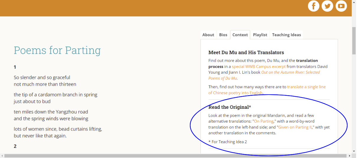 Other works have links to the original language versions towards the top of the "Context"; below, you'll see an example of a such a link for the Chinese poet Du Mu's "Poems for Parting."Â