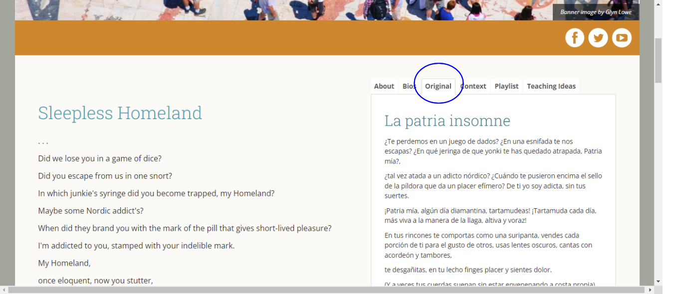 Some pieces are available in their original languages on WWB Campus—for example, Carmen Boullosa's poem "Sleepless Homeland" is available in Spanish via the "Original" tab. Â