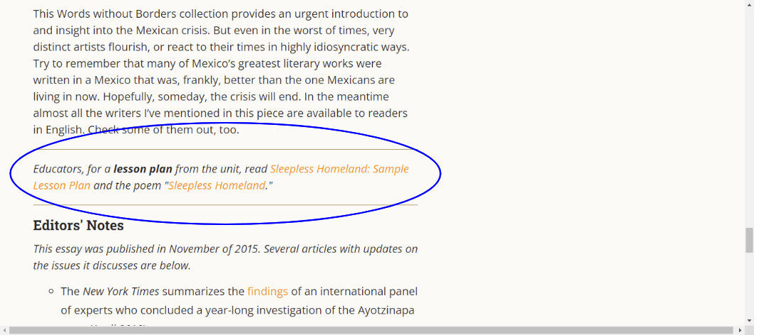 The story, poem, or essay will be on the left side of the screen. On the right side or beneath the literature, you can use the tabs to see bios, definitions, context (for instance, a video interview with the author, or a photo gallery of the place a poem is describing), teaching ideas, and ways to further explore the culture, author, or themes. There are also links to related reading at the bottom of the page.