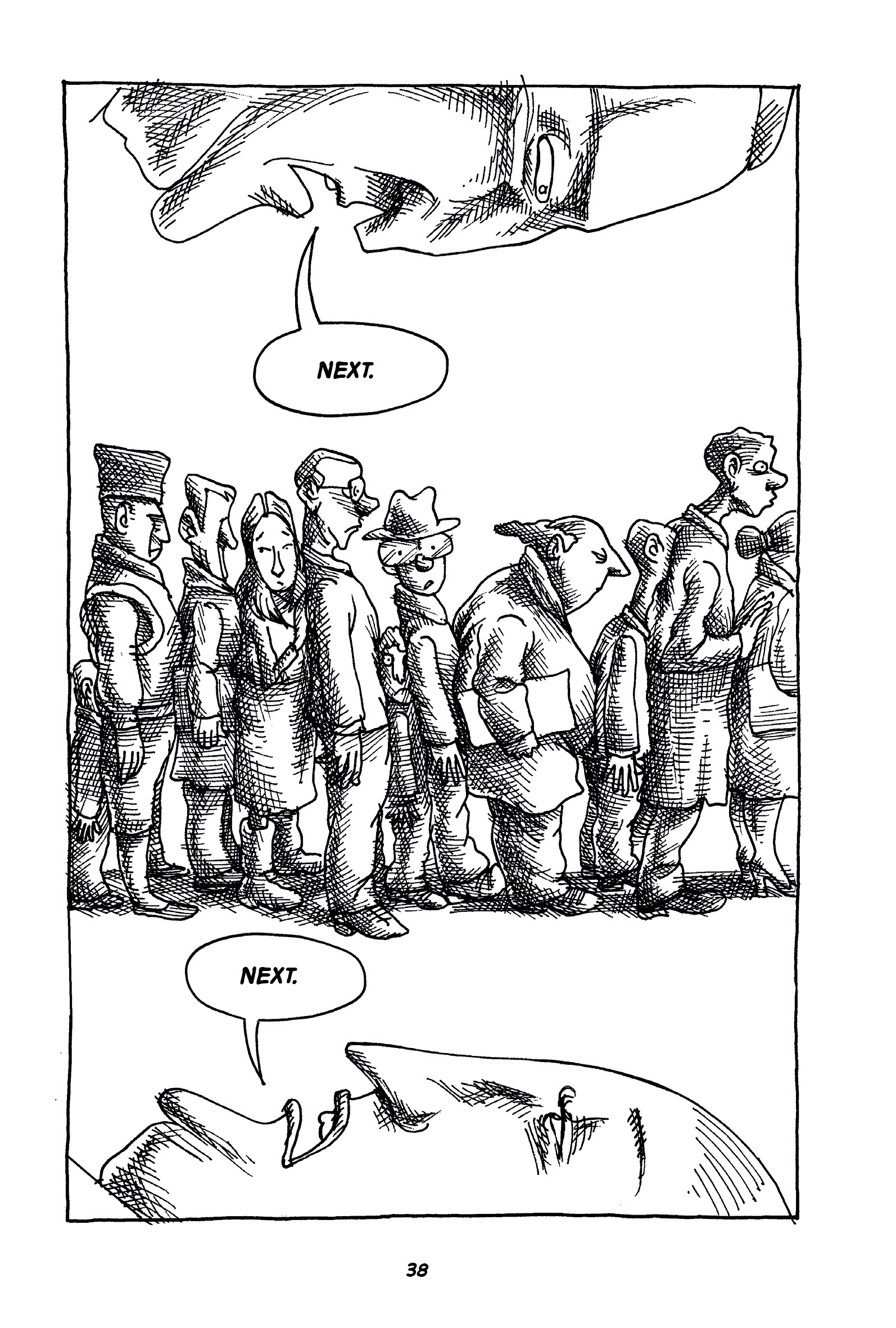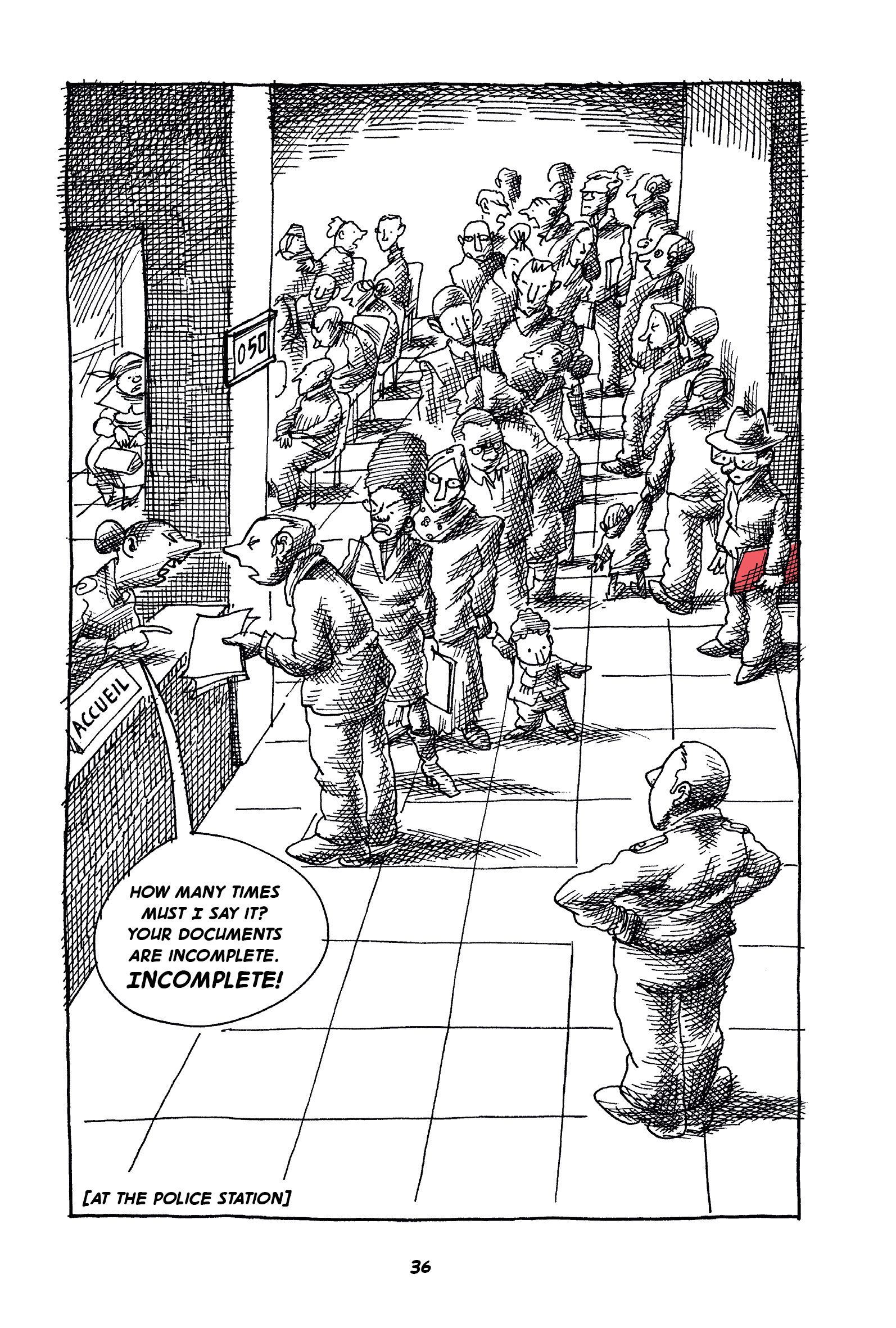 Captions: WOMAN AT DESK: How many times must I say it? Your documents are incomplete. INCOMPLETE! [At the police station.] (The crowd is now inside, waiting in a different line: men, women, children, elderly people. A police office watches them and a woman shouts from behind a desk.)