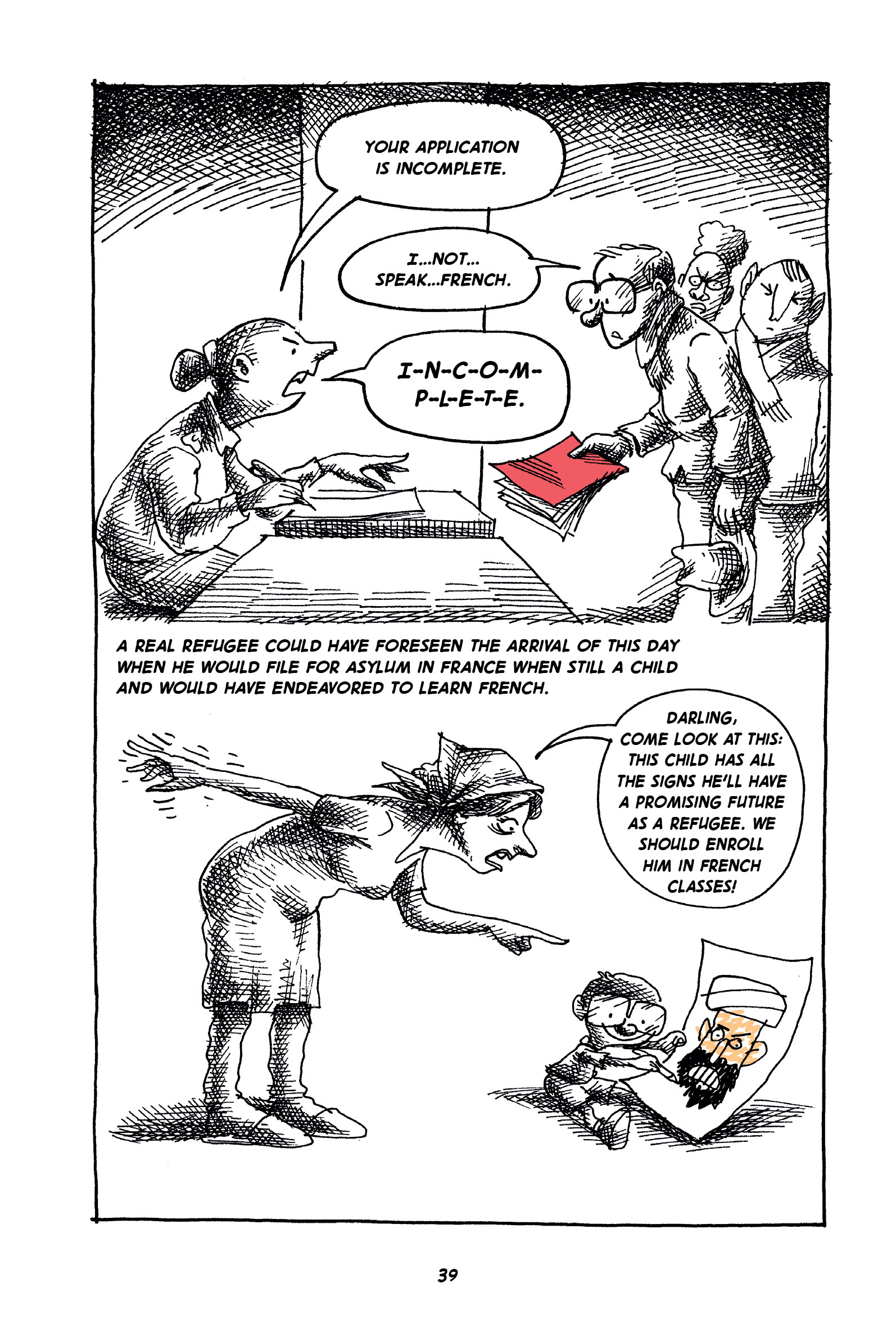 Captions: WOMAN AT DESK: Your application is incomplete. MAN IN GLASSES: I...not...speak...French. WOMAN AT DESK: I-N-C-O-M-P-L-E-T-E. A real refugee would have seen the arrival of this day when he would file for asylum in France when still a child and would have endeavored to learn French. (A new frame: a proud child displays a cartoon of an imam.) MOTHER: Darling, come look at this. This child has all the signs he'll have a promising future as a refugee. We should enroll him in French classes!