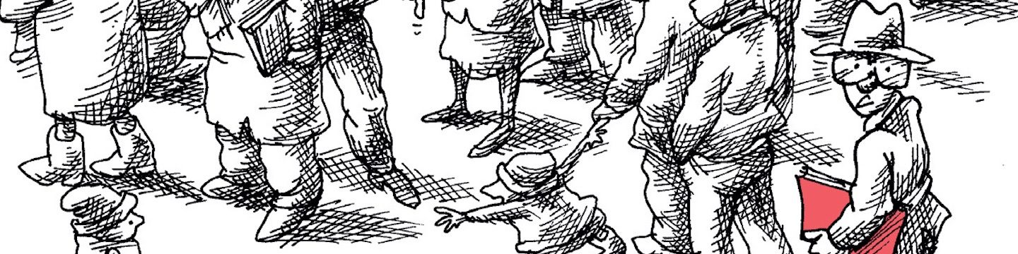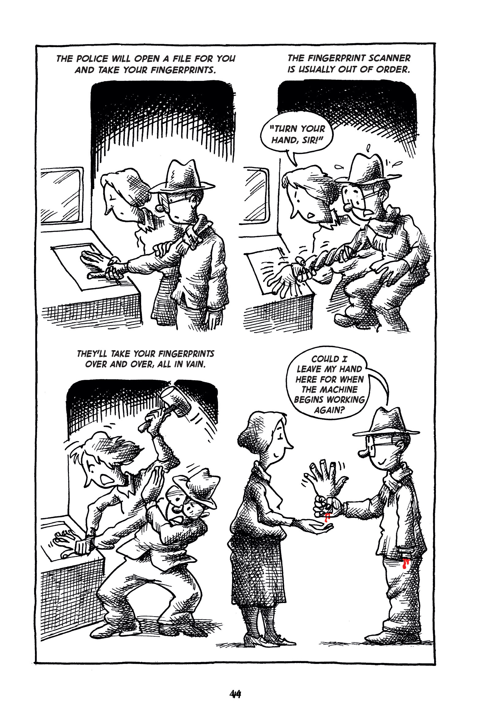 Captions: The police will open a file for you and take your fingerprints. The fingerprint scanner is usually out of order. IMMIGRATION AGENT to MAN IN GLASSES: "Turn your hand, sir!" They'll take your fingerprints over and over again, in vain. (The immigration agent hits the man's hand with hammer.) MAN IN GLASSES (holding out his own dismembered hand): Could I leave my hand here for when the machine begins working again? (The immigration agent smiles.)