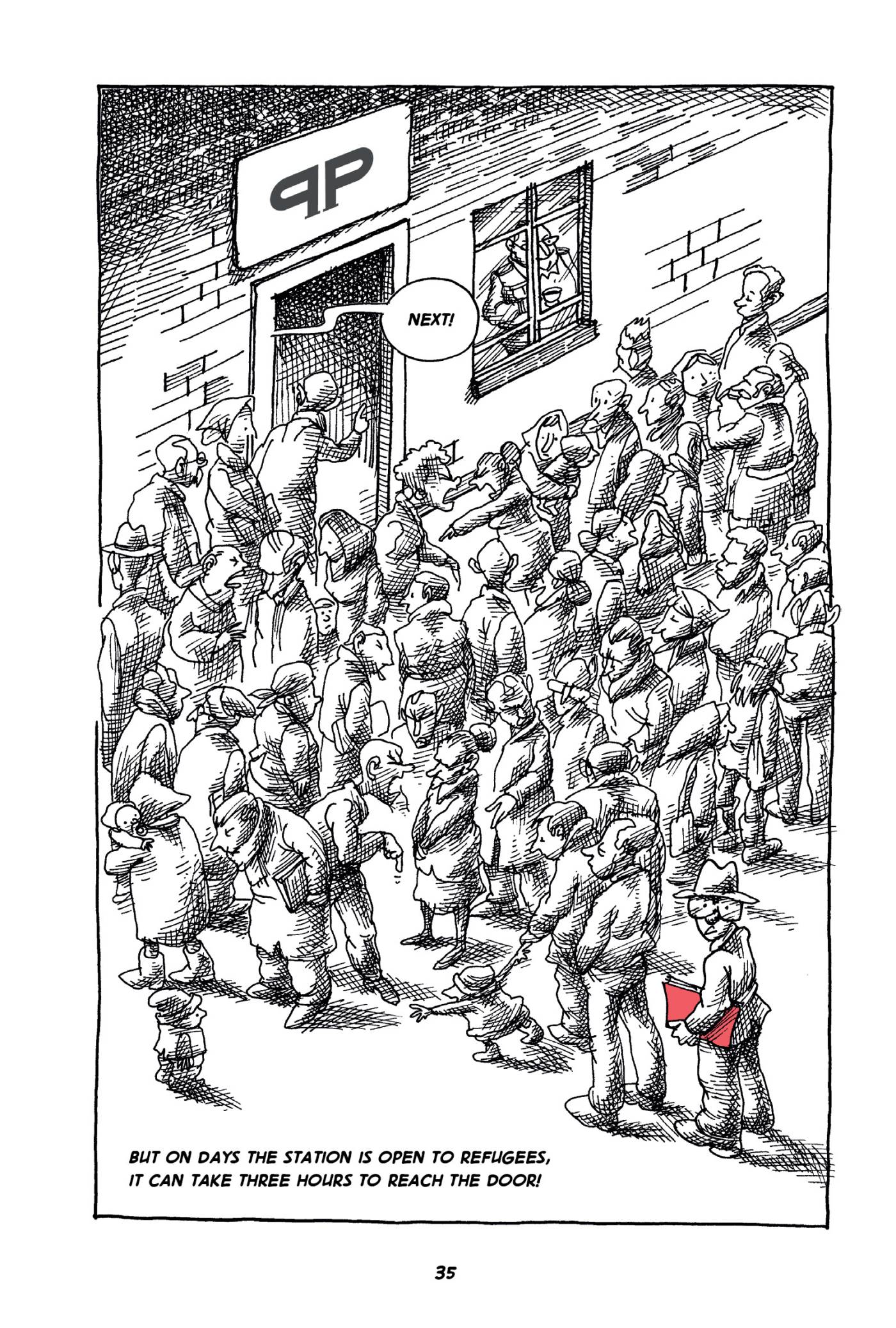 Captions: But on days the station is open to refugees, it can take three hours to reach the door! (A crowd waits; the man in glasses from the first picture is at the very end of the line.) From behind the door, an unseen voice shouts "Next!"