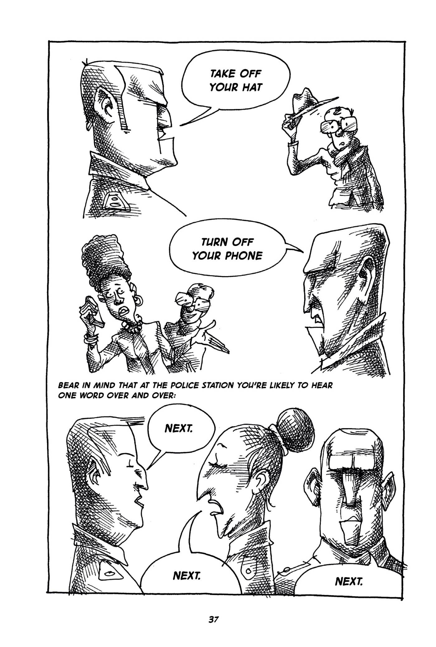 Captions: IMMIGRATION OFFICIAL 1: Take off your hat. (Man in glasses removes hat, looking worried.) IMMIGRATION OFFICIAL 2: Turn off your phone. (A woman holding a phone obeys.) Bear in mind that at the police station you're likely to hear one word over and over: IMMIGRATION OFFICIAL 1: NEXT. IMMIGRATION OFFICIAL 2: NEXT. IMMIGRATION OFFICIAL 3: NEXT.