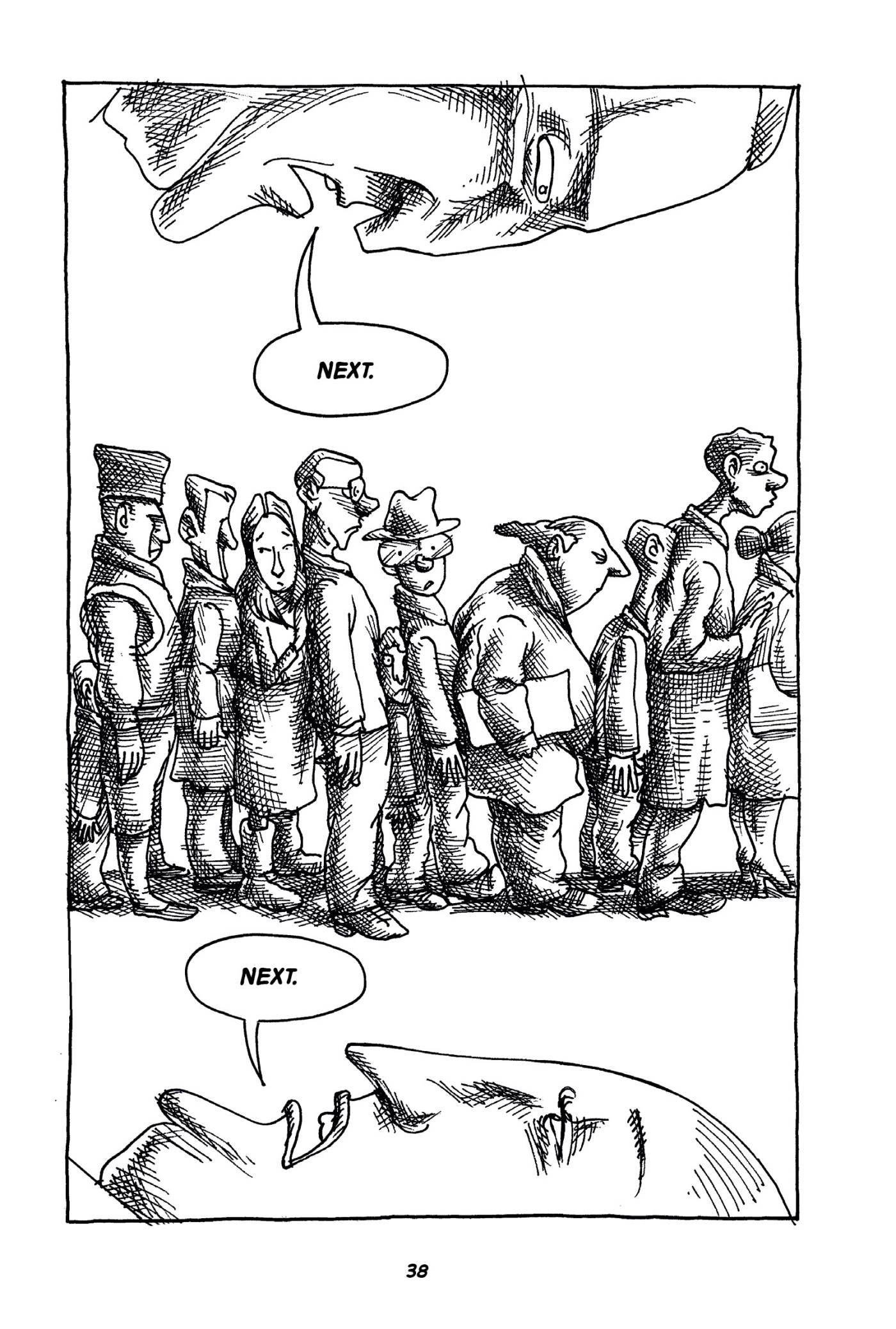 Captions: IMMIGRATION OFFICIAL 4: NEXT. IMMIGRATION OFFICIAL 5: NEXT. (Sandwiched between the enormous profiles of the immigration officials, worried people wait in line. The man in glasses is among them.)