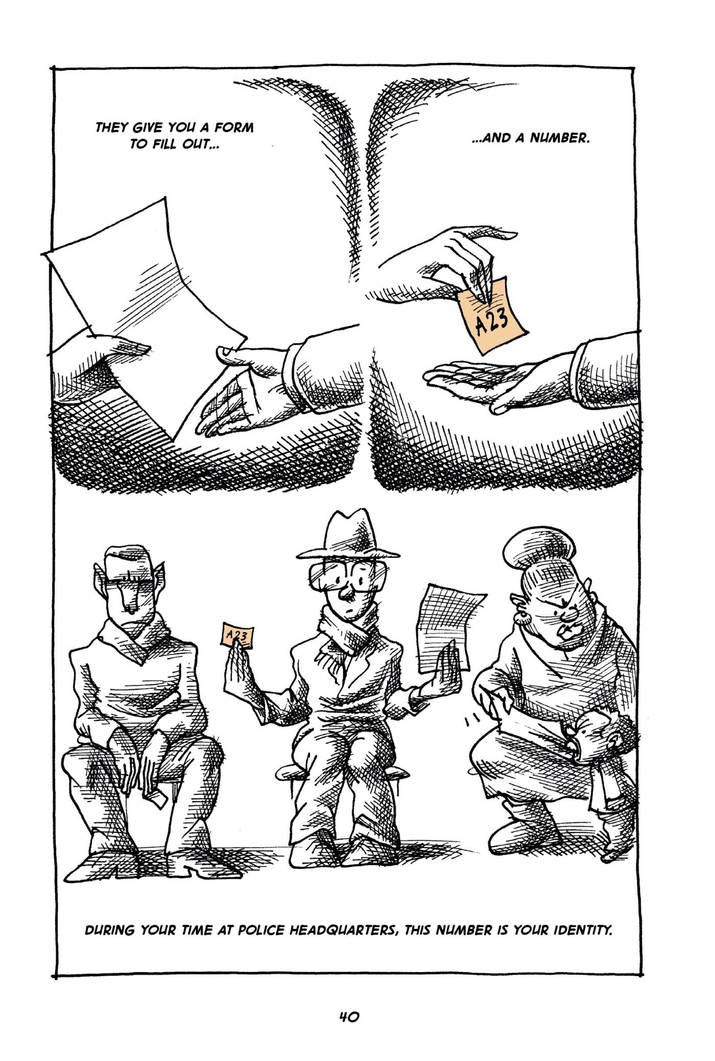 Captions: They give you a form to fill out...and a number. During your time at police headquarter, this number is your identity. (Man in glasses holds up his number: A23.)