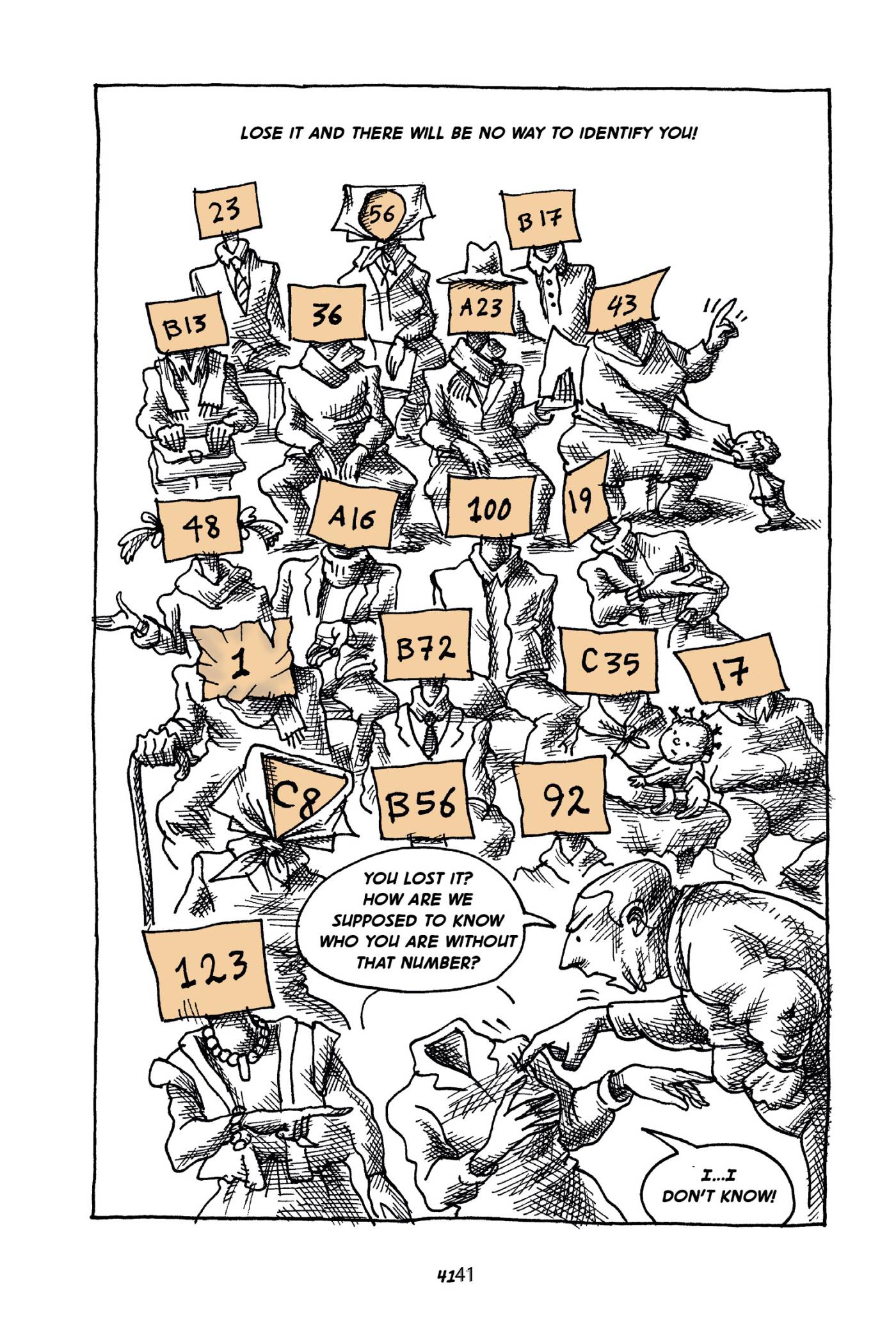 Captions: Lose it and there will be no way to identify you! (Refugees in a crowd, their heads replaced with numbers.) IMMIGRATION OFFICIAL to a headless woman refugee: You lost it? How are we supposed to know who you are without that number? HEADLESS WOMAN REFUGEE: I...I don't know!