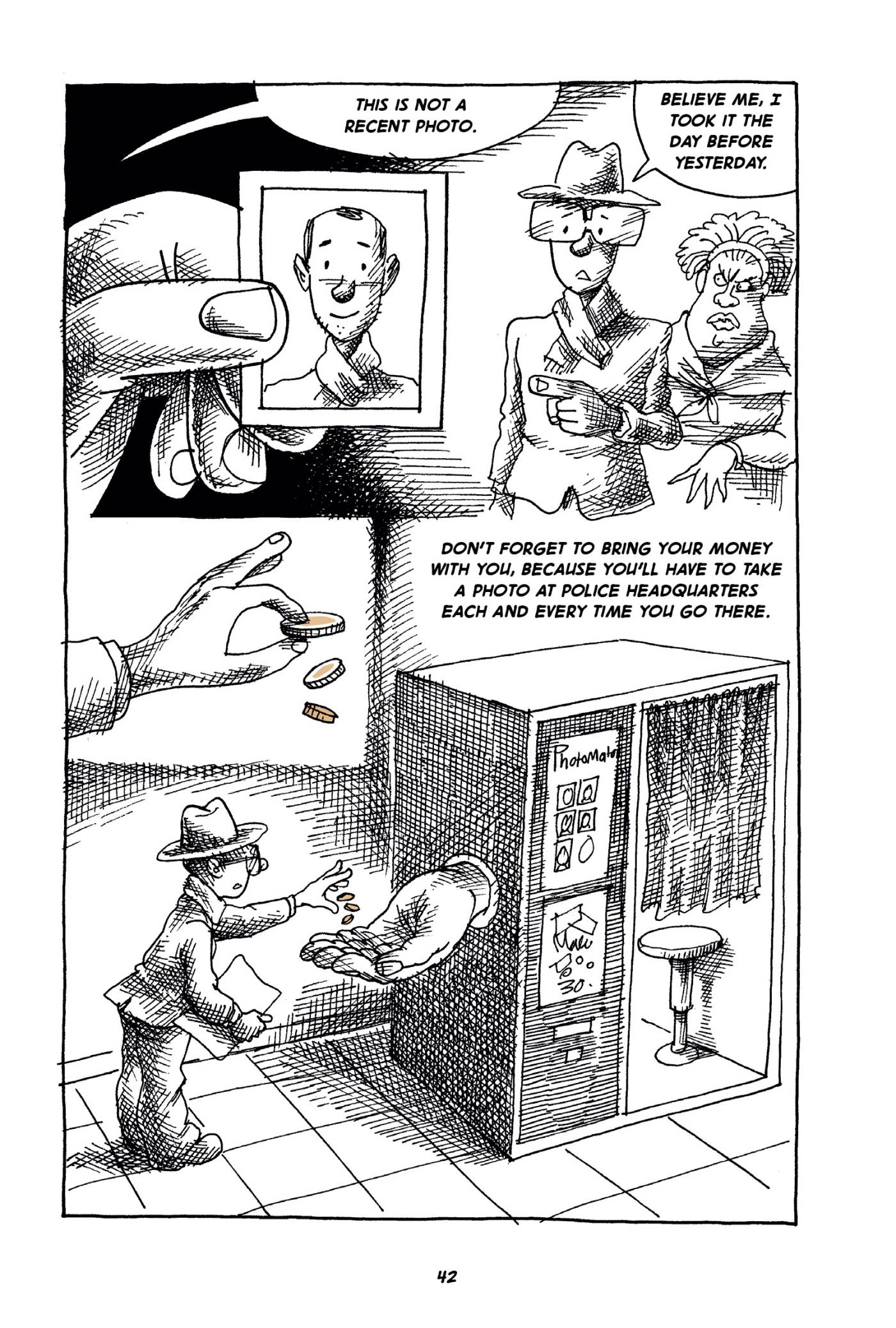 Captions: IMMIGRATION OFFICIAL: This is not a recent photo. MAN IN GLASSES: Believe me, I took it the day before yesterday. Don't forget to bring your money with you because you'll have to take a photo at police headquarters each and every time you go there. (A giant hand reaches out from the photo booth to take man's coins.)