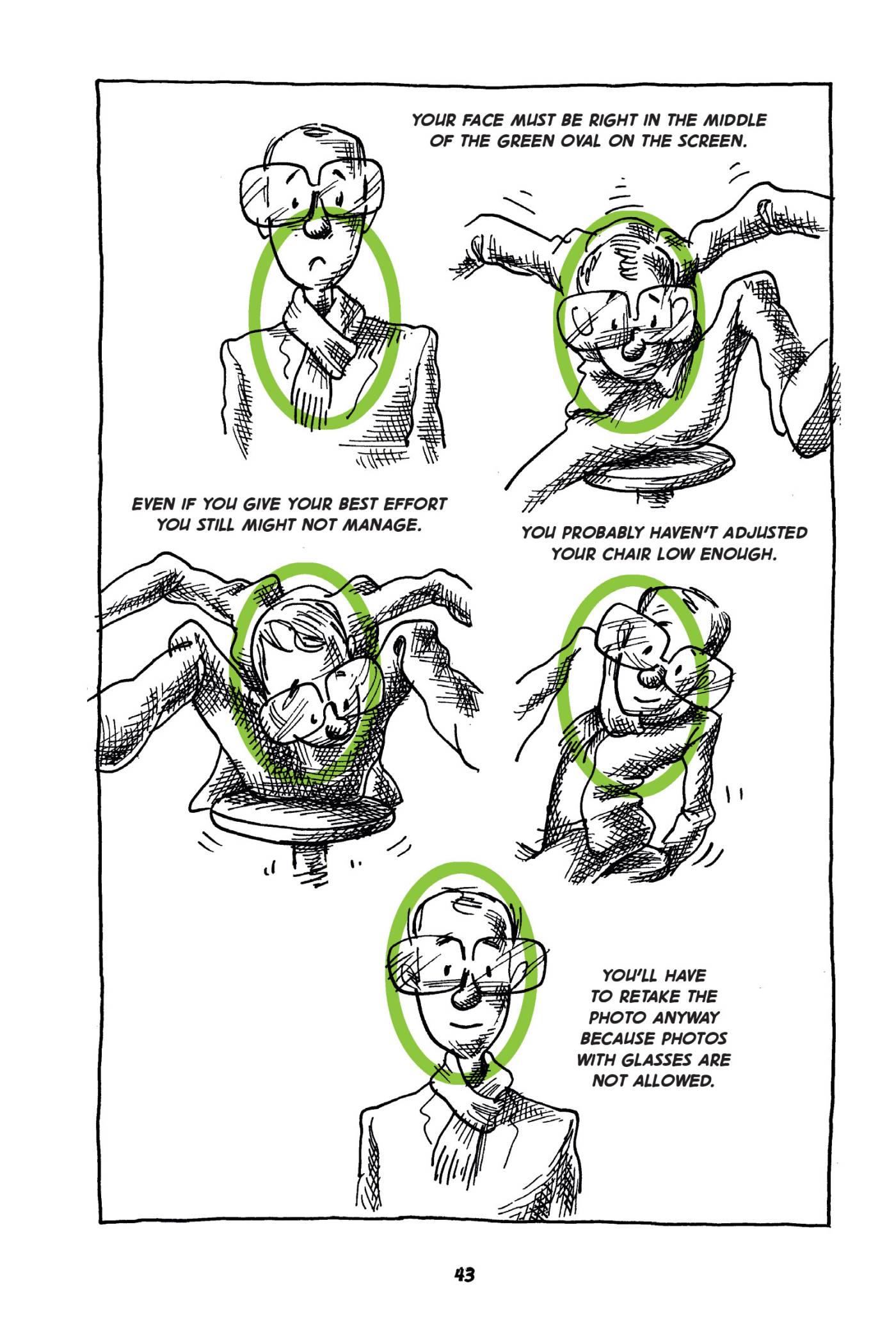 Captions: Your face must be right in the middle of the green oval on the screen. Even if you give your best effort you still might not manage. You probably haven't adjusted your chair low enough. (The man in glasses contorts himself into several positions, finally managing to place his face inside the green oval.) You'll have to retake the photo anyway because photos with glasses are not allowed.
