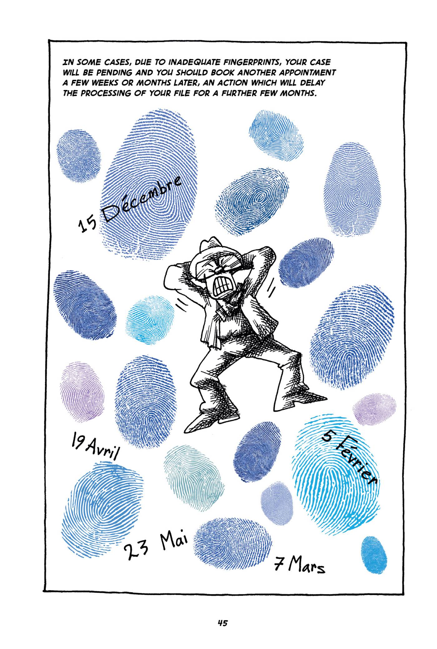 Captions: In some cases, due to inadequate fingerprints, your case will be pending and you should book another appointment a few weeks or months later, an action which will delay the processing of your file for a further few months. (Surrounded by a crowd of giant fingerprints and dates, the man in glasses grits his teeth in frustration.)
