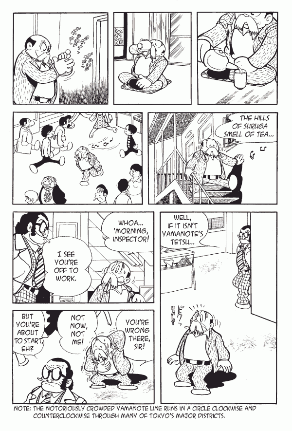 Captions: Tetsu (singing): The hills of Suruga smell of tea⦠Inspector: Well, if it isnāt Yamanoteās Tetsu⦠Tetsu: Whoa⦠āmorning, inspector! Inspector: I see youāre off to work. Tetsu: Youāre wrong there, sir! Not now, not me! Inspector: But youāre about to start, eh?