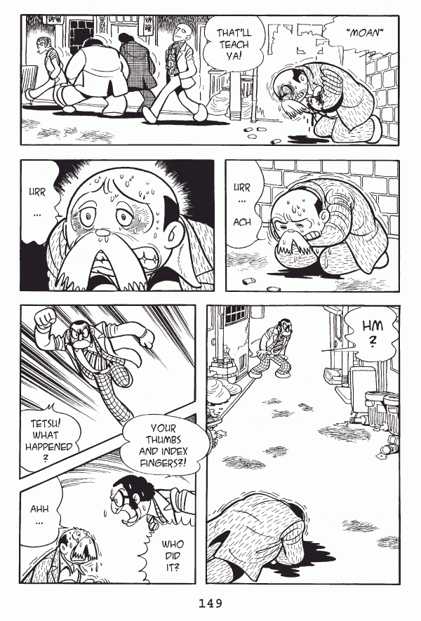 Captions: Tetsu: āMoanā Man: Thatāll teach ya! Tetsu: Urrā¦ach Tetsu: Urr⦠Inspector: Hm? Inspector: Tetsu! What happened? Inspector: Your thumbs and index fingers?! Who did it? Tetsu: Ahhā¦