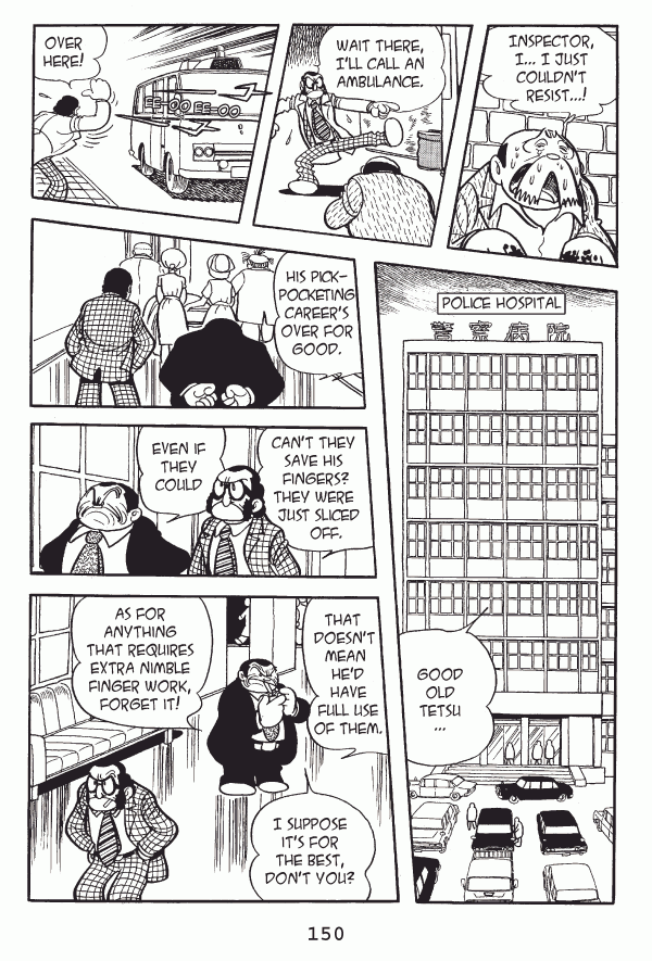 Captions: Tetsu: Inspector, Iā¦I just couldnāt resistā¦! Inspector: Wait there, Iāll call an ambulance. Inspector: Over here! (Man): Good old Tetsu⦠Man: His pickpocketing careerās over for good. Inspector: Canāt they save his fingers? They were just sliced off. Man: Even if they could Man: That doesnāt mean heād have full use of themā¦. As for anything that requires extra nimble finger work, forget it! ā¦I suppose itās for the best, donāt you?