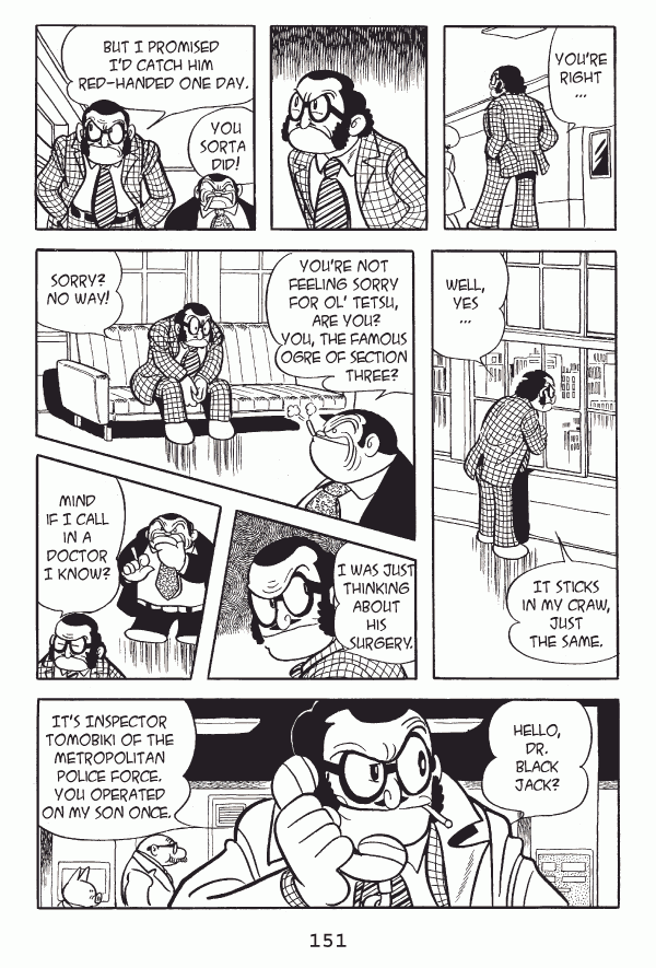 Captions: Inspector: Youāre right⦠Inspector: But I promised Iād catch him red-handed one day. Man: You sorta did! Inspector: Well, yesā¦It sticks, in my craw, just the same. Man: Youāre not feeling sorry for olā Tetsu, are you? You, the famous ogre of section three? Inspector: Sorry? No way! Inspector: I was just thinking about his surgery. Inspector: Mind if I call in a doctor I know? Inspector: Hello, Dr. Black Jack?...Itās Inspector Tomobiki of the Metropolitan Police Force. You operated on my son once.