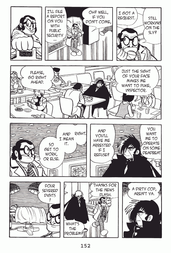 Captions: Inspector: Still working on the sly?...I got a request. Inspector: Oh? well, if you donāt come,ā¦Iāll file a report on you with public security.. Dr. Black Jack: Just the sight of your face makes me want to puke, Inspector. Inspector: Please, go right ahead. Dr. Black Jack: You want me to operate on some deadbeat and youāll have me arrested if I refuse? Inspector: Right. And I mean it. So get to work, or else. Dr. Black Jack: A dirty cop, arenāt ya. Inspector: Thanks for the news flash. Black Jack: Whatās the problem? Inspector: Four severed digits!