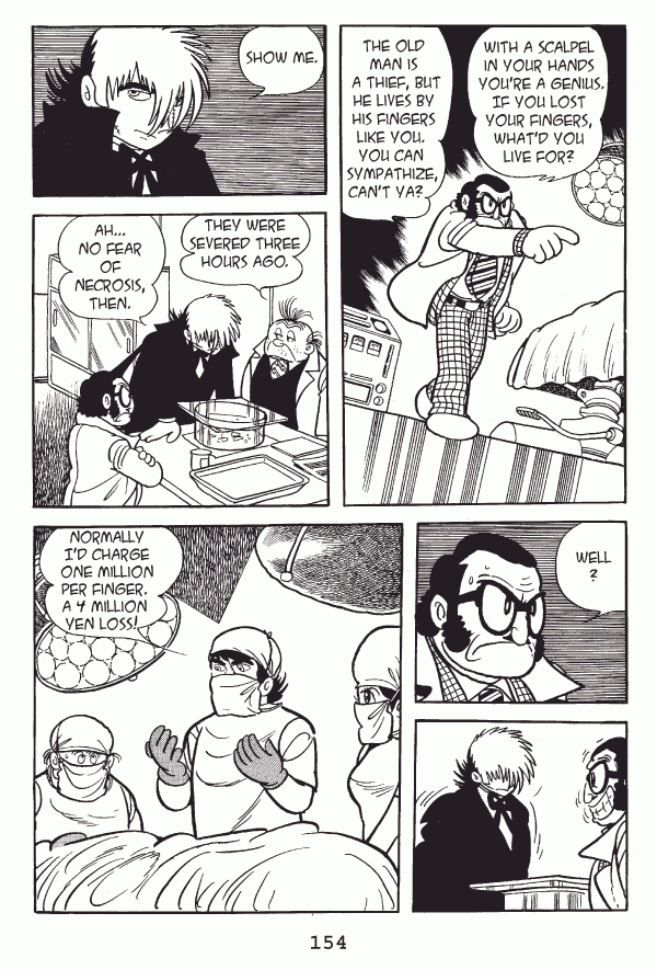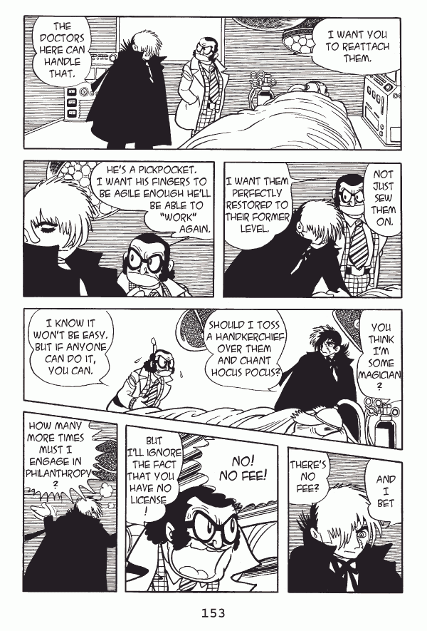 Captions: Inspector: I want you to reattach them. Black Jack: The doctors here can handle that. Inspector: Not just sew them onā¦I want them perfectly restored to their former level. Inspector: Heās a pickpocket. I want his fingers to be agile enough heāll be able to āworkā again. Black Jack: You think Iām some magician?...You I toss a handkerchief over them and chant hocus pocus? Inspector: I know it wonāt be easy. But if anyone can do it, you can. Black Jack: And I betā¦thereās no fee? Inspector: No! No fee!...But Iāll ignore the fact that you have no license. Black Jack: How many more times must I engage in philanthropy?