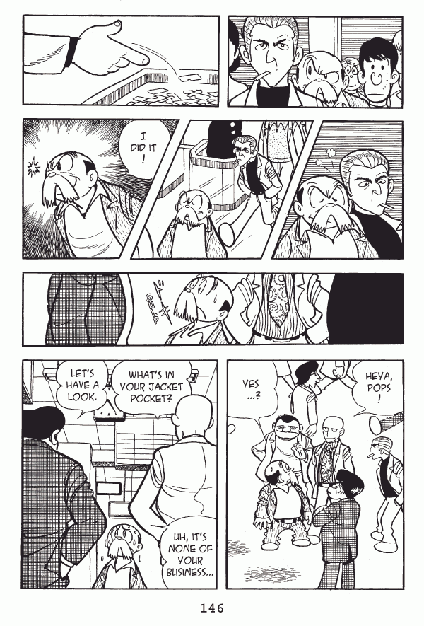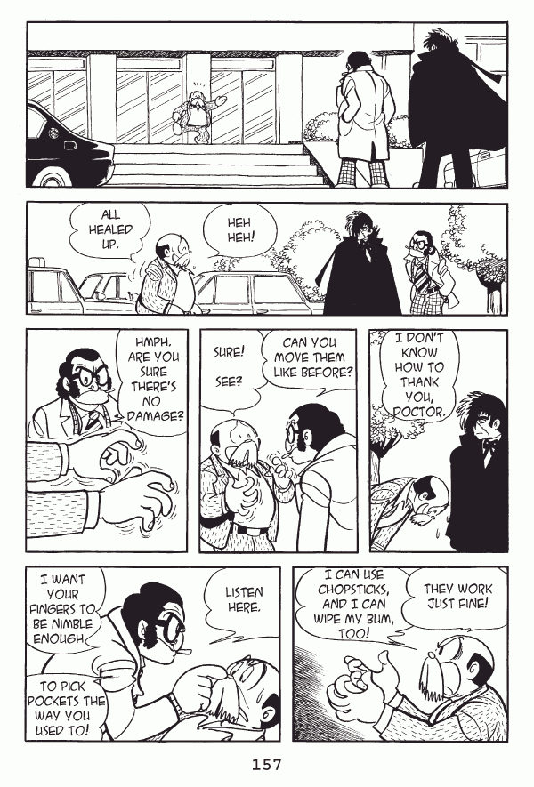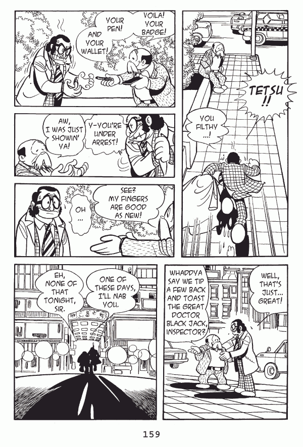 Captions: Inspector: Tetsu! You filthyā¦! Tetsu: Voila! Your badge! Your pen! And your wallet! Inspector: Y-youāre under arrest! Tetsu: Aw, I was just showinā ya! Tetsu: See? My fingers are good as new! Inspector: Oh⦠Inspector: Well, thatās just⦠great! Tetsu: Whaddya say we tip a few back and toast the great Doctor Black Jack, Inspector? Inspector: One of these days, Iāll nab you. Tetsu: Eh, none of that tonight, sir.