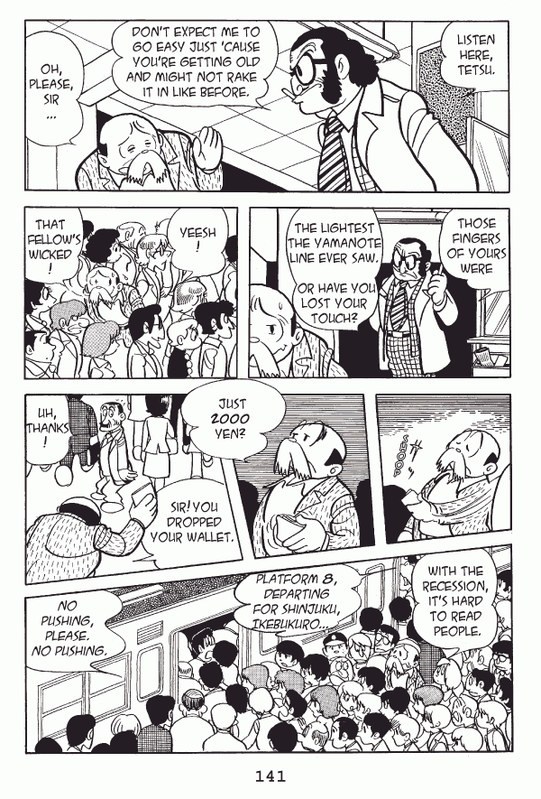 Captions: Inspector: Listen here, Tetsu. Donāt expect me to go easy just ācause youāre getting old and might not rake it in like before. Tetsu: Oh, please, sir⦠Inspector: Those fingers of yours wereā¦the lightest the Yamanote Line ever saw. Or have you lost your touch? People in crowd: Yeesh! ⦠That fellowās wicked! Tetsu: Just 2000 yen? Tetsu: Sir! You dropped your wallet. Man: Uh, thanks! Tetsu: (in crowd): with the recession, itās hard to read people. Announcer: Platform 8, departing for Shinjuku, Ikebukuroā¦.No pushing, please. no pushing.