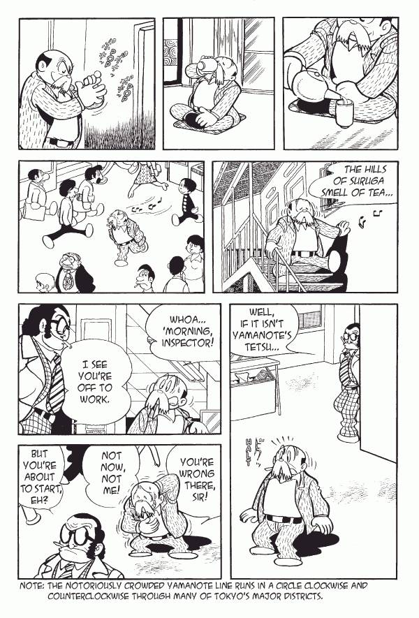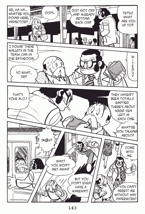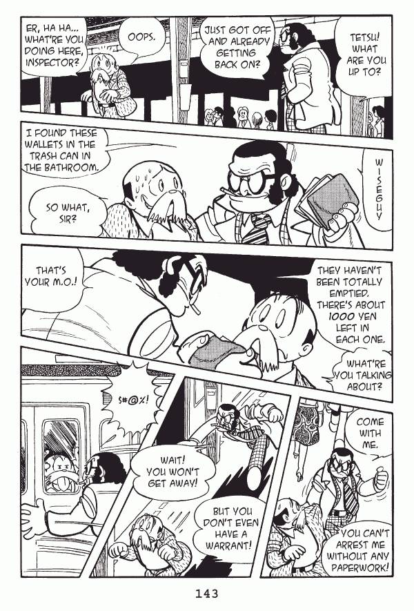 Captions: Inspector: Tetsu! What are you up to? Just got off and already getting back on? Tetsu: Oops. Er, hahaā¦whatāre you doing here, Inspector? Inspector: Wiseguy. I found these wallets in the trash can in the bathroom. Tetsu: So what, sir? Inspector: They havenāt been totally emptied. Thereās about 1000 yen left in each one. Tetsu: Whatāre you talking about? Inspector: Thatās your M.O.! Inspector: Come with me. Tetsu: You canāt arrest me without any paperwork! Inspector: Wait! You wonāt get away! Tetsu: But you donāt even have a warrant! Inspector: $#@%!
