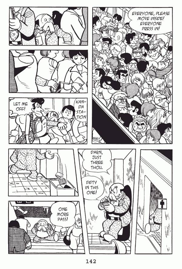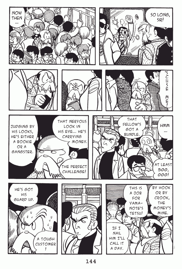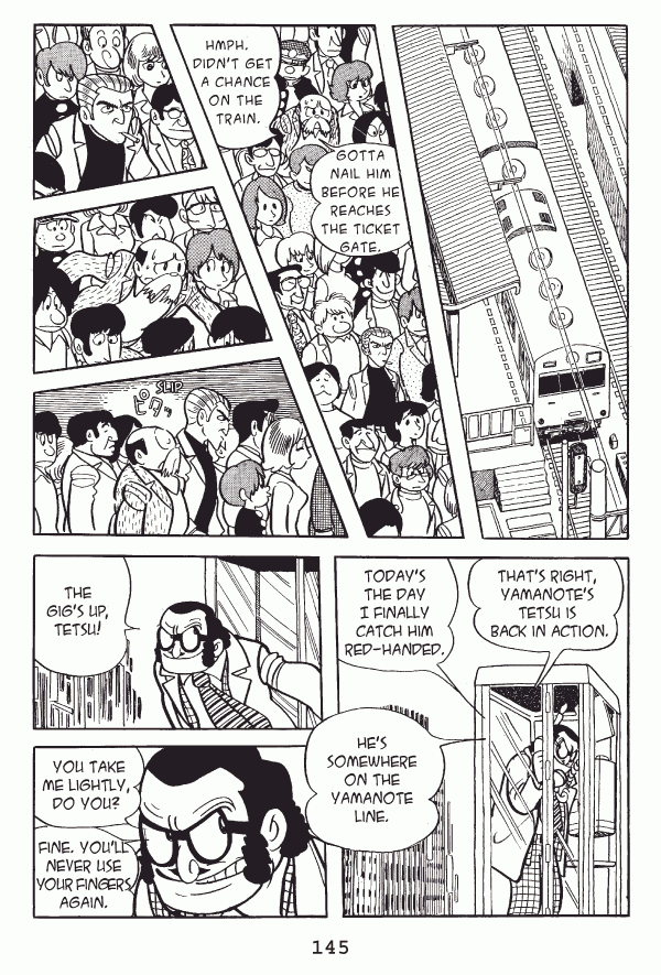 Captions: Tetsu: So long, sir! Tetsu: Now then⦠Tetsu: āScuse me! Tetsu: Hmmā¦At least 500,000! That fellowās got a bundle. That nervous look in his eyeā¦heās carrying moneyā¦The perfect challenge!... Judging by his looks, heāth either a bookie or a gangster. Tetsu: By hook or by crook, the moneyās mineā¦This is a job for Yamanoteās Tetsu!... If I nail him Iāll call it a day. Tetsu: A tough customer! Heās got his guard up.
