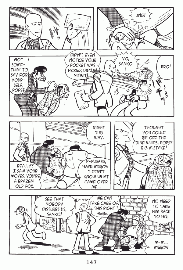 Captions: Tetsu: Ung! Man: Bro! Man: Yo, Sanko!...Didnāt even notice your pocket was picked, didja? Nitwit! Man: Got somethinā to say for yourself, pops? Man: Thought you could rip off the blue whips, pops? Big mistake! Man: Right this way. Tetsu: P-please, have mercy! I donāt know what came over me⦠Man: Really? I saw your moves, youāre a brazen old fox. Inspector: N need to take him back to HQ. Tetsu: M-mā¦mercy! Man: We can take care of this right hereā¦.See that nobody disturbs us, Sanko!