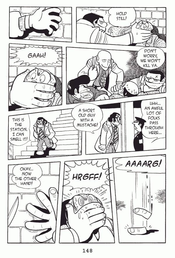 Captions: Man: Hold still! Man: Donāt worry, we wonāt kill ya. Tetsu: Gaah! Security guard: Uhhā¦an awful lot of folks pass through here⦠Inspector: A short old guy with a mustache! Inspector: This is the station. I can smell it! (Tetsu): AAAARGH! (Tetsu): HRGFF! (Man): Okayā¦now the other hand!