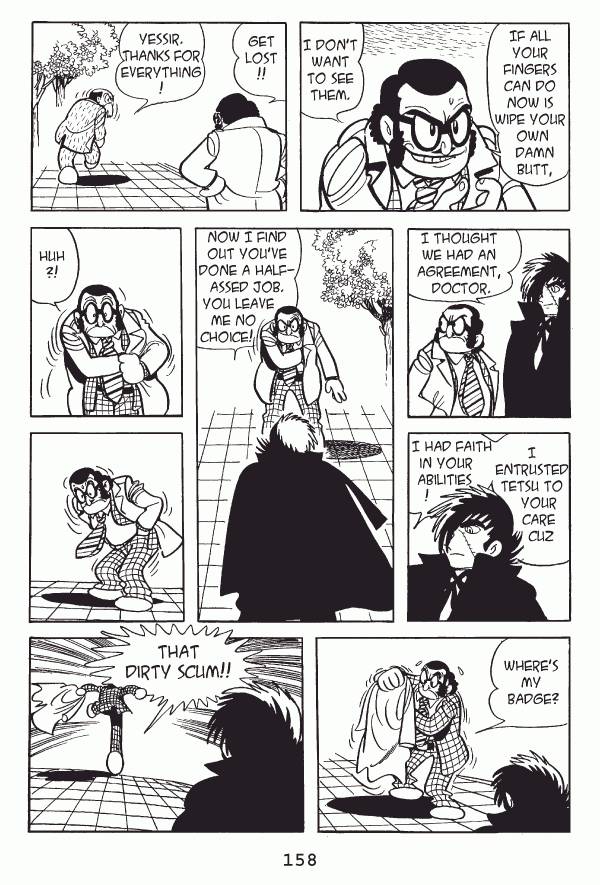 Captions: Inspector: If all your fingers can do now is wipe your own damn butt, I donāt want to see them. Inspector: Get lost!! Tetsu: Yessir. Thanks for everything! Inspector: I thought we had an agreement, Doctor. Inspector: I had faith in your abilities! I entrusted Tetsu to your care cuz Inspector: Now I find out youāve done a half-assed job. You leave me no choice! Inspector: Huh?! Inspector: Whereās my badge? Inspector: That dirty scum!