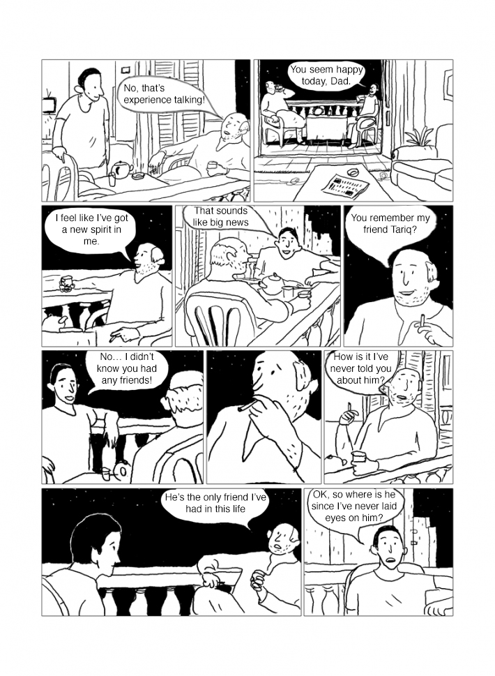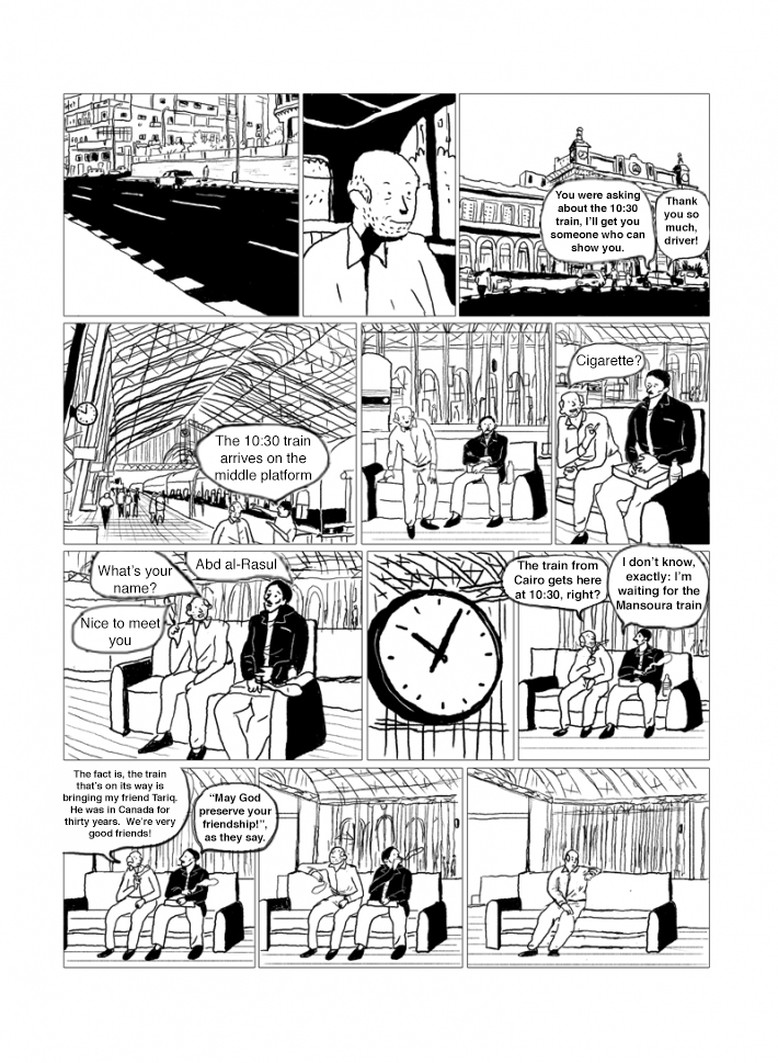 Captions: Taxi driver: You were asking about the 10:30 train, I’ll get you someone who can show you. Father: Thank you so much, driver! Person: The 10:30 train arrives on the middle platform. Father: Cigarette? Father: What’s your name? Person on bench: Abd al-Rasul Father: Nice to meet you Father: The train from Cairo gets here at 10:30, right? Abd al-Rasul: I don’t know, exactly: I’m waiting for the Mansoura train Father: The fact is, the train that’s on its way is bringing my friend Tariq. He was in Canada for thirty years. We’ve very good friends! Abd al-Rasul: “May God preserve your friendship!”, as they say.