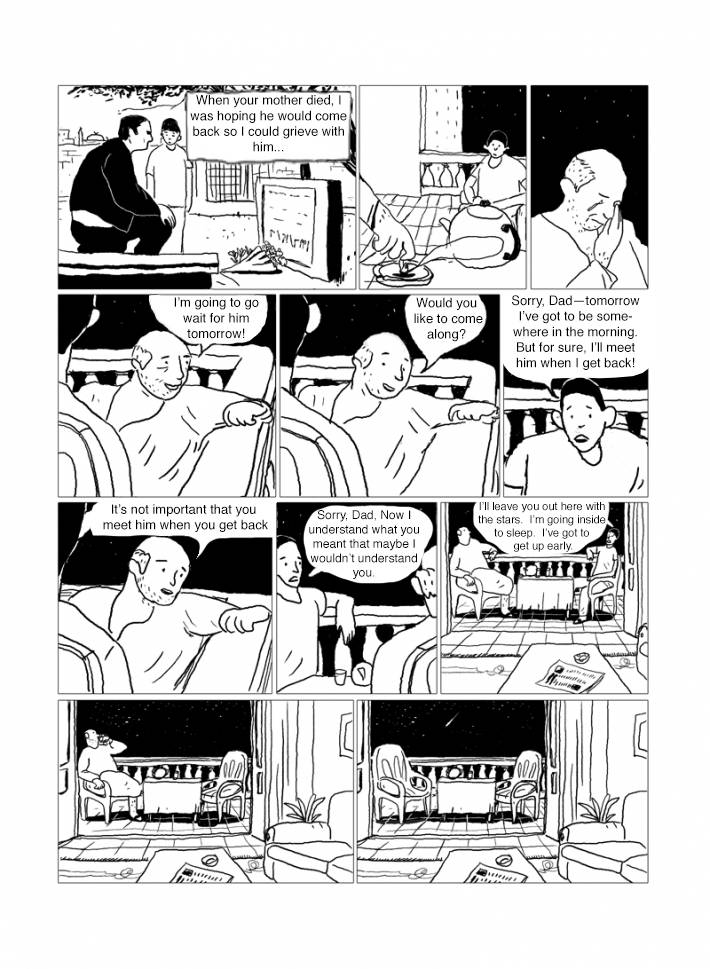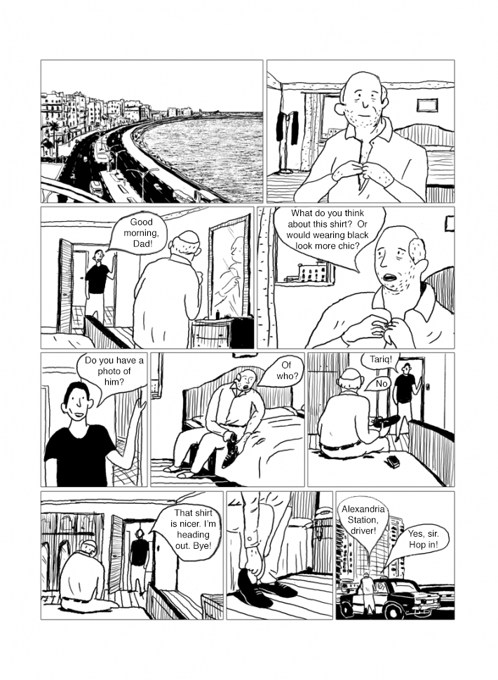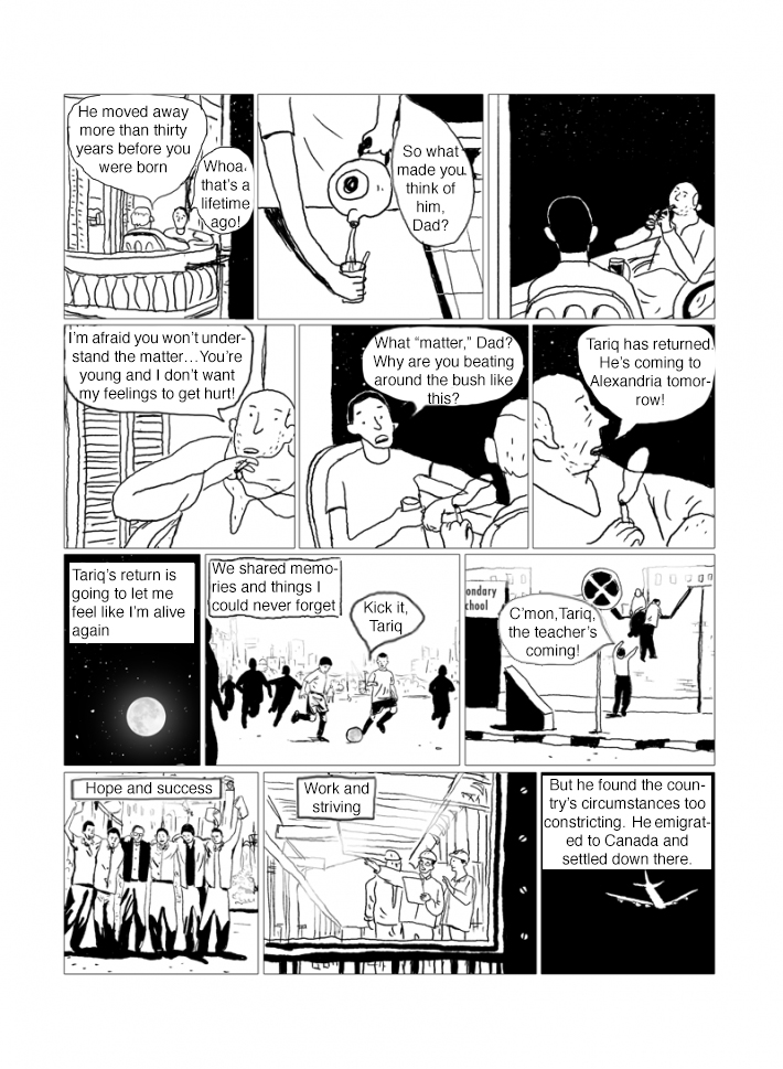 Captions: Father: He moved away more than thirty years before you were born Son: Whoa, that’s a lifetime ago! Son: So what made you think of him, Dad? Father: I’m afraid you won’t understand the matter . . . You’re young and I don’t want my feelings to get hurt! Son: What “matter,” Dad? Why are you beating around the bush like this? Father: Tariq has returned. He’s coming to Alexandria tomorrow! [Tariq’s return is going to let me feel like I’m alive again.] [We shared memories and things I could never forget.] Father as kid: Kick it, Tariq. Father as kid: C’mon, Tariq, the teacher’s coming! [Hope and success] [Work and striving] [But he found the country’s circumstances too constricting. He emigrated to Canada and settled down there.]