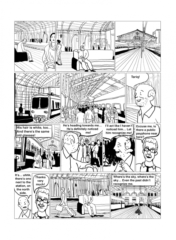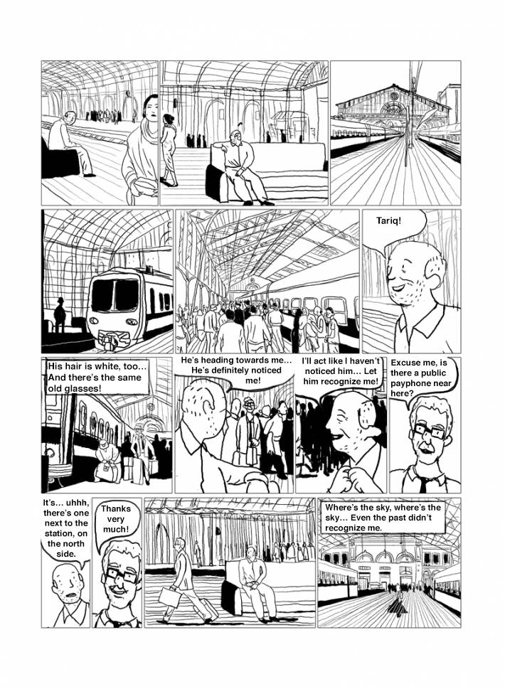 Captions: Father: Tariq! [His hair is white, too…And there’s the same glasses!] Father: He’s heading towards me…He’s definitely noticed me! Father: I’ll act like I haven’t noticed him… Let him recognize me! Tariq: Excuse me, is there a public payphone near here? Father: It’s…uhhh, there’s one next to the station, on the north side. Tariq: Thanks very much! [Where’s the sky, where’s the sky… Even the past didn’t recognize me.]