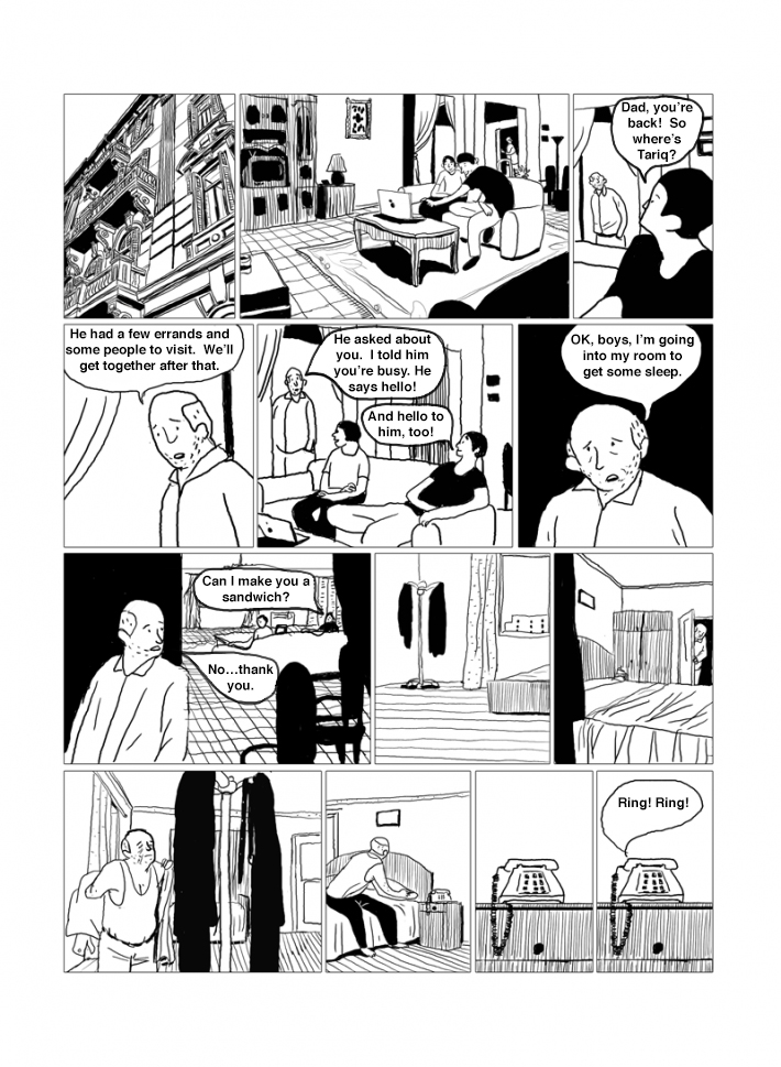 Captions: Son: Dad, you’re back! So where’s Tariq? Father: He had a few errands some people to visit. We’ll get together after that. Father: He asked about you. I told him you’re busy. He says hello! Son: And hello to him, too! Father: OK, boys, I’m going into my room to get some sleep. Son: Can I make you a sandwich? Father: No…thank you. Phone: Ring! Ring!