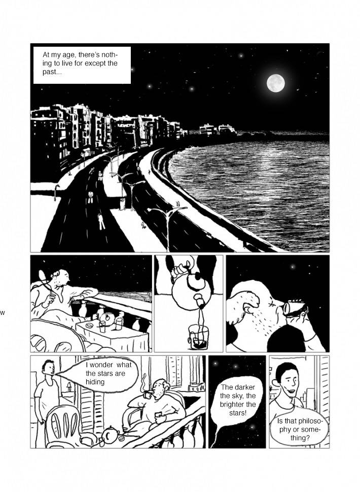 Captions: [At my age, there’s nothing to live for except the past…] Son: I wonder what the stars are hiding Father: The darker the sky, the brighter the stars! Son: Is that philosophy or something?