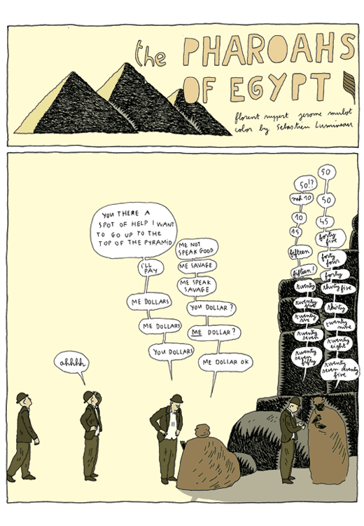 Captions: The Pharaohs of Egypt /florent ruppert Jerome merlot color by Sebastien Lusmineau Tourist 1: ahhhhh Tourist 2: You there a spot of help I want to go up to the top of the Pyramid Guide 1: Me not speak good Tourist 2: I’ll pay Guide 1: Me savage Tourist 2: Me dollars Guide 1: You dollar? Tourist 2: Me dollars Guide 1: Me dollar? Tourist: You dollars Guide 1: me dollar ok Guide 2: 50 Tourist 3: 50?! Guide 2: 50 Tourist 3: nah 10 Guide 2: 45 Tourist 3: 15 Guide 2: forty five Tourist 3: fifteen Guide 2: forty four Tourist 3: fifteen! Guide 2: forty Tourist 3: twenty Guide 2: thirty five Tourist 3: twenty five Guide 2: thirty Tourist 3: twenty six Guide 2: twenty nine Tourist 3: twenty seven Guide 2: twenty eight Tourist 3: twenty seven fifty Guide 2: twenty seven seventy five
