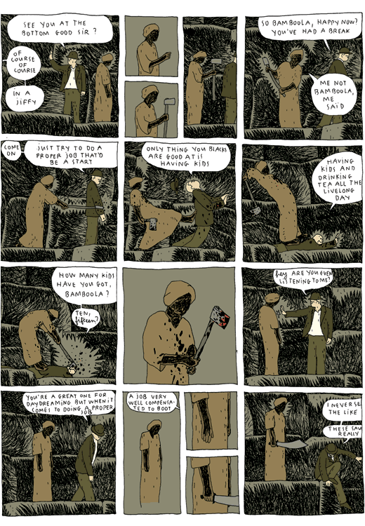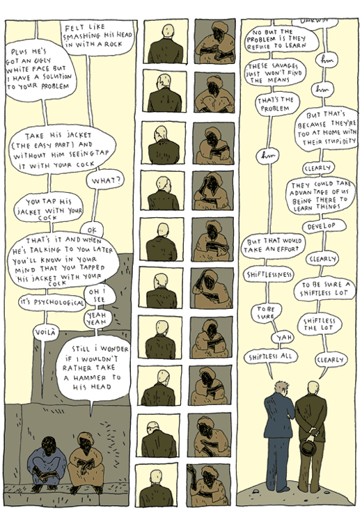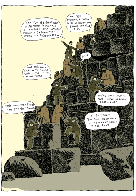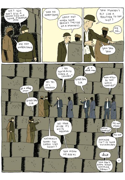 Captions: Tourist: Eh? you don’t give a damn how old your pyramids are Guide: Me not understand Tourist: Yah no harm done, least not when your brain’s the size of a monkey’s Tourist: Yah monkey’s bit like a brother to you wot? Guide: Me no… Tourist: yah yah yah Tourist 1: Ah a white man. Good day sir Tourist 2: I see you’ve also hired a savage? Tourist 3: Yes yes it’s handier Tourist 2: Yes odor aside it’s quite helpful Tourist 3: Naturally yours too smells like sweat? Tourist 2: You mean he reeks Tourist 4: Ah a white man. Good day sir Tourist 5: How often do you wash yourself? Guide: Me not speak Tourist 5: Wash yourself? Guide: Me not Tourist 5: Washing isn’t in your vocabulary, Christ Guide: . Tourist 5: You don’t know what washing means?