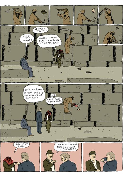 Captions: Tourist 1: Oh there you are Tourist 2: We’ve just arrived. Tourist 1: Quicker coming down than going up at any rate Tourist 2: Quicker than it was building the pyramid at any rate. Tourist 1: Yes, going back to the hotel? Tourist 1: Hullo, what’s this…. Tourist 1: What’ve you got there on your shoulder?